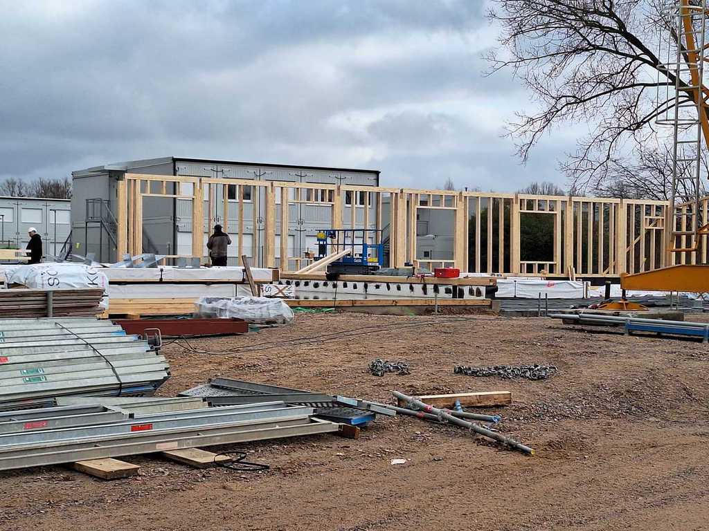 Ein wenig gedauert hat es noch, bis die Betonsohle ins Metallgeflecht geflossen ist. Aber ist die hier zu sehen. Zuvor kam noch eine Lage Beton darunter und beide müssen nun durchtrocken. Laut Bauleitung soll nun schnell gehen. Wie schnell, das hängt unter anderen auch von der Witterung ab. Ob allerdings in 2025 noch ein Richtfest zu feiern ist, sollte man mit einem Fragezeichen versehen.