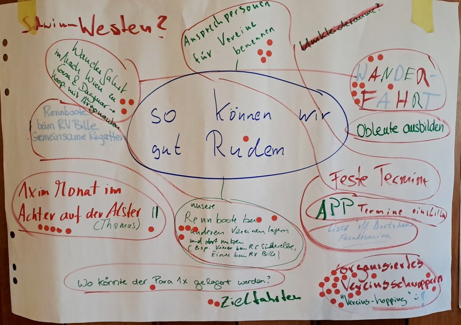 In dieser Zeit werden einige Mannschaftsboote und Einer am Yachtclub lagern, wo der WRC zwei Stellplätze mietet. Anhand von drei Plakaten wurden weitere Ideen und Wünsche gesammelt, anschließend bewertet und Personen zugeordnet, die sich um einzelne Projekte kümmern. Eine genaue Auflistung kommt noch über das Protokoll. Wer den Termin versäumt hat, kann gern noch einsteigen: Gute Ideen sind immer willkommen. Hier eine Übersicht.