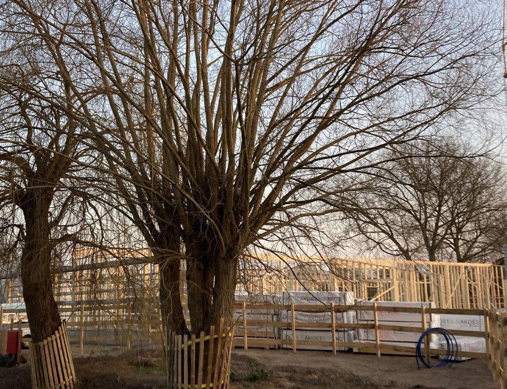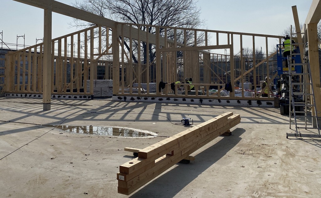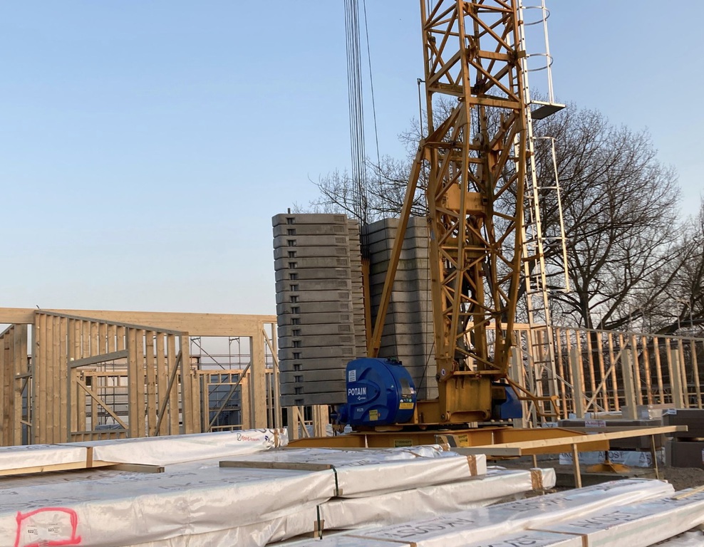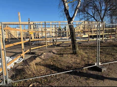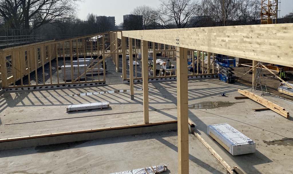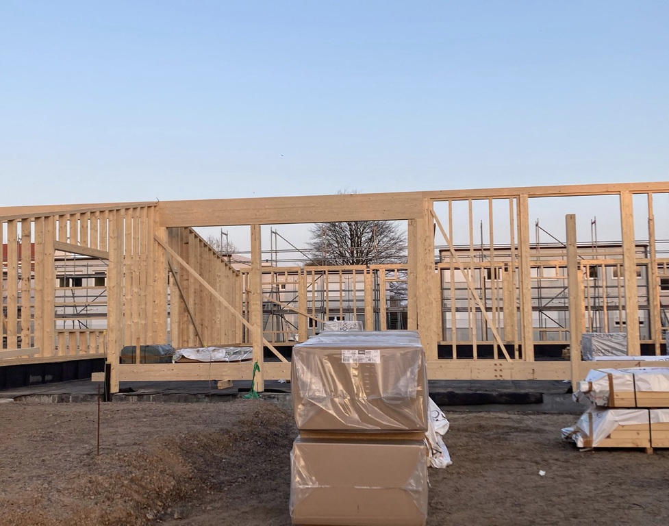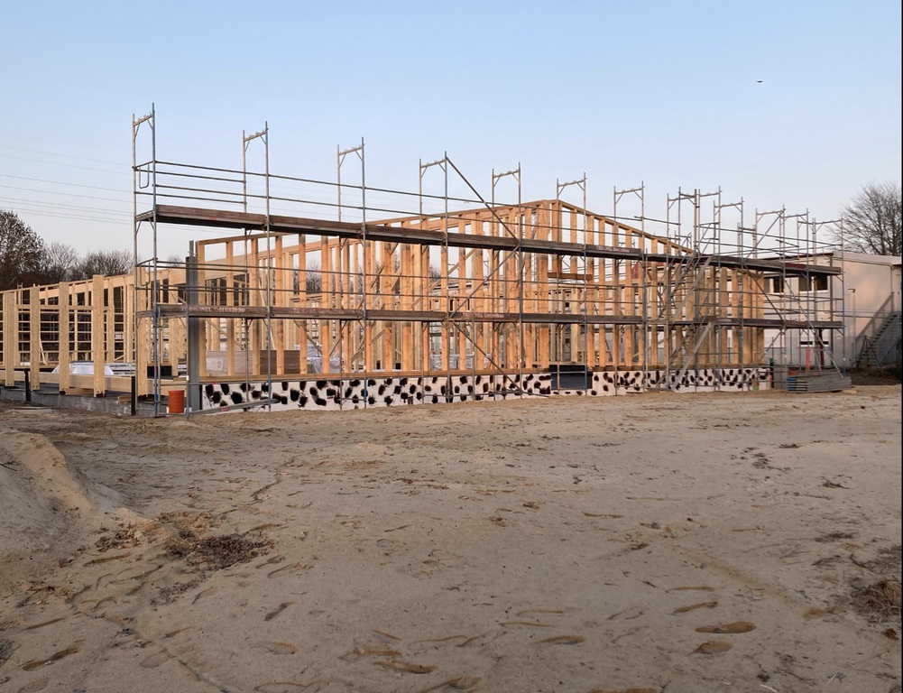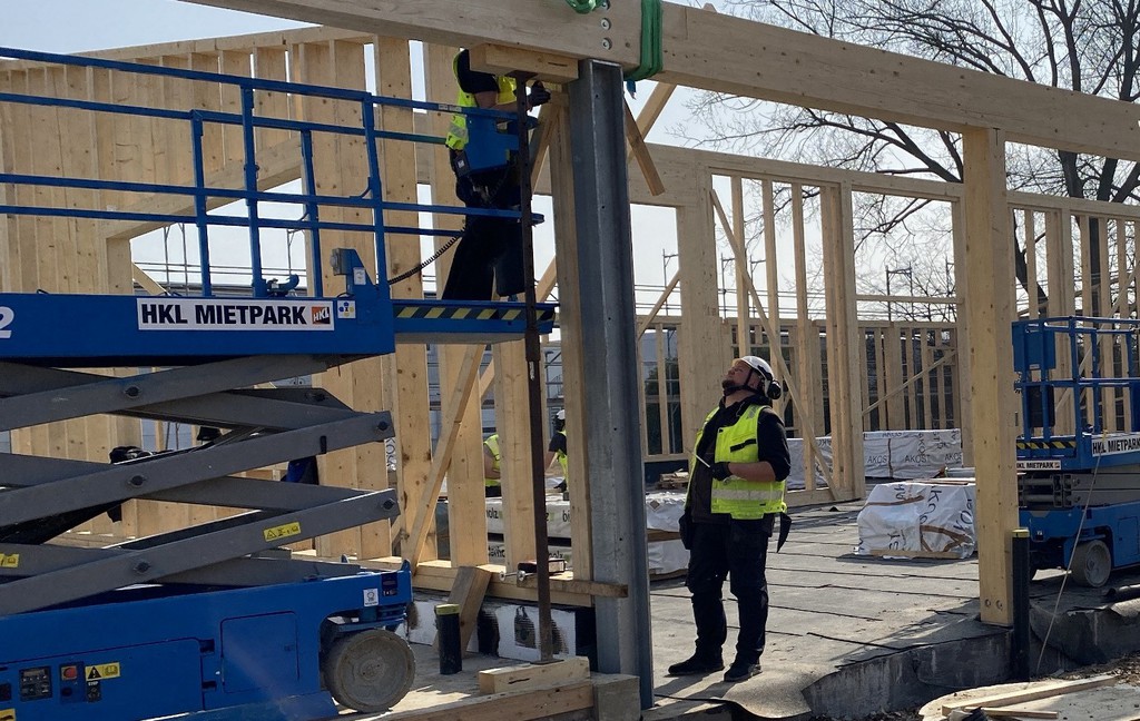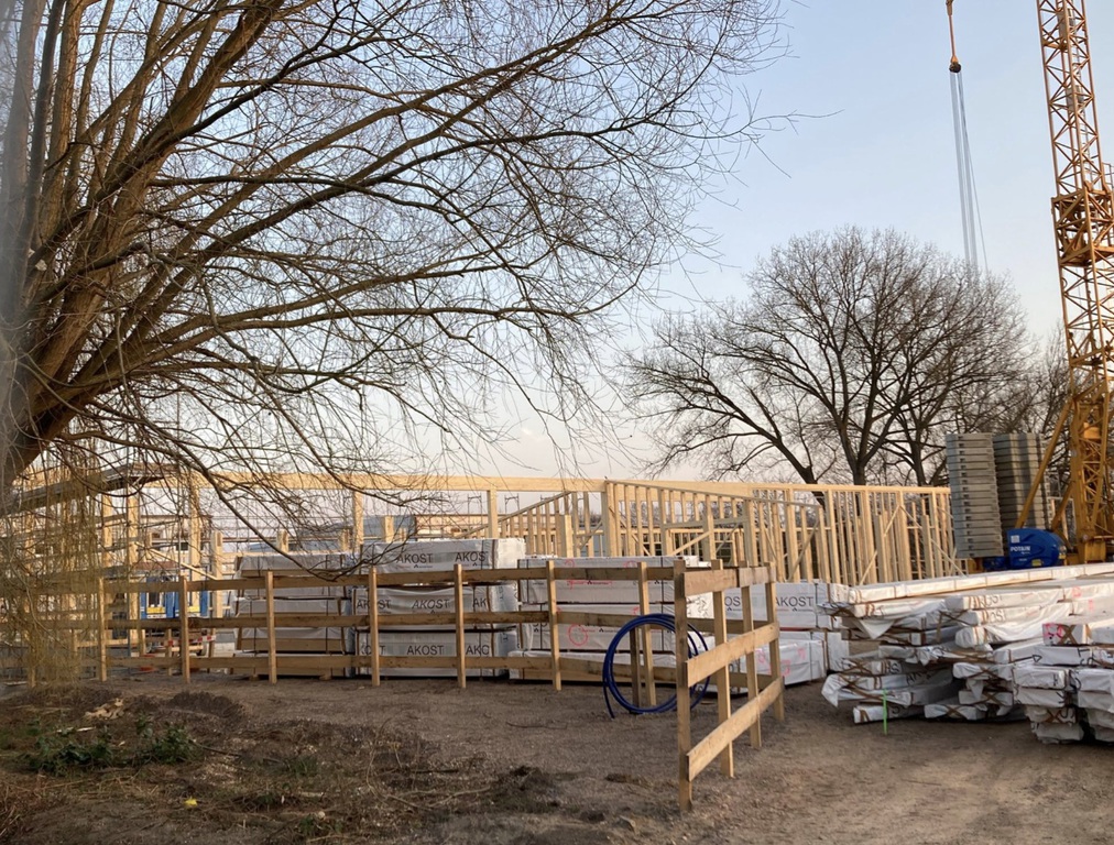 Auf unserer Baustelle geht es sichtbar voran. Aktuell arbeiten sechs bis sieben Zimmerer an vier Tagen pro Woche bis etwa 18:30 Uhr daran, das Holzgerüst für die Außenwände und die Dachkonstruktion zu errichten. Wer am Gelände vorbeikommt, kann den Fortschritt derzeit täglich beobachten.